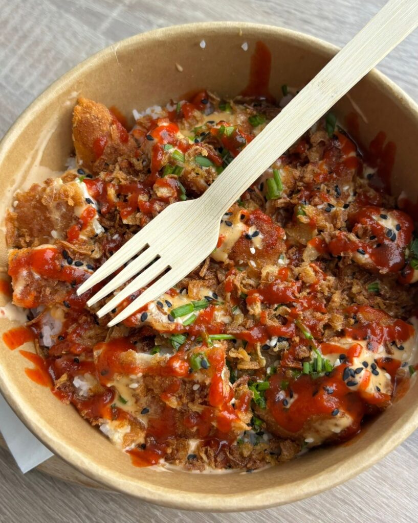 Poulet pané maison, croustillant, sauce secrète maison (et on ne lâchera RIEN), riz thaïlandais, topping légèrement pimenté